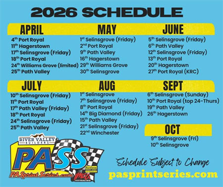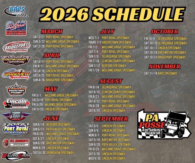 Central PA Sprint Car Series Schedule Following yesterday’s landmark announcement of the new Central PA 410 Sprint Car Series, officials have released additional details outlining the complete 2026 schedule, points system, race format, and season-ending payout structure. The series—created through unprecedented collaboration among the region’s top tracks—aims to deliver the most unified and competitive 410 sprint car platform ever assembled in the Keystone State. The inaugural season will feature 47 races at 11 different tracks, showcasing the depth and tradition of Central Pennsylvania sprint car racing. The schedule blends weekly staples with marquee events, creating a competitive schedule of non-sanctioned races across the region. Winners are guaranteed at least $6,000 at every event and the features are a minimum of $600 to take the green; several events will push well beyond that mark. These 47 series events represent exclusive 410 sprint car dates at each participating track and are in addition to every track’s individual schedule. 2026 CENTRAL PA 410 SPRINT CAR SERIES SCHEDULE