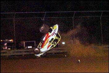 (LEFT) Escaping uninjured, Bret Mellenberndt takes a series of flips during Friday’s USAC Sprint B-Main at Ocala, FL’s Bubba Raceway Park along with (RIGHT) Jarett Andretti taking a rough ride at Ocala, FL’s Bubba Raceway Park barrel rolling in the first turn during Friday’s USAC Sprint A-Main event...........ANOTHER HEIN BROTHERS' "ACTION" PHOTOGRAPHS