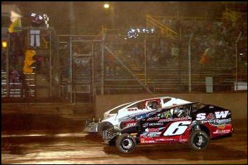 (LEFT) Racing wide open, Donny Schatz rockets down the front straight away during the World of Outlaw Sprint show at Lincoln Speedway (RIGHT) An exciting finish in the Modified feature at Lernerville Speedway as Mat Williams (6) and Jim Weller III (23) charge across the finish line wheel to wheel. Although left for speculation of who won the race, it may not always be the car that crosses the finish line first that may be awarded the win of the race. When the dust settle, Mat Williamson (6) was awarded the feature win...........ANOTHER HEIN BROTHERS' "ACTION" PHOTOGRAPHS