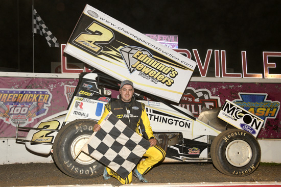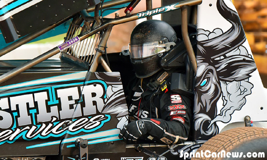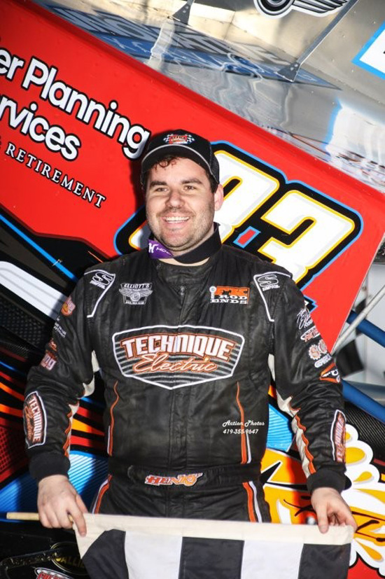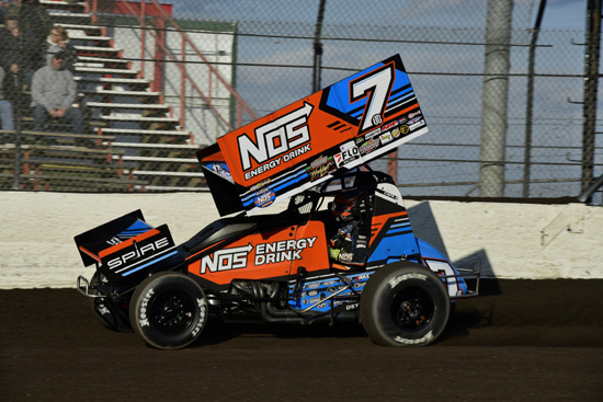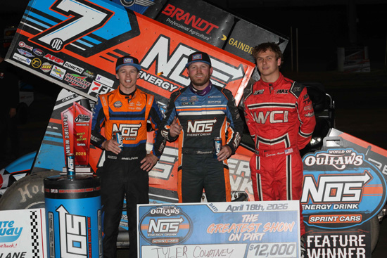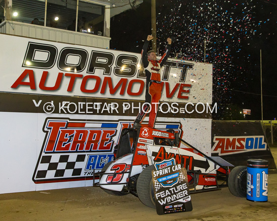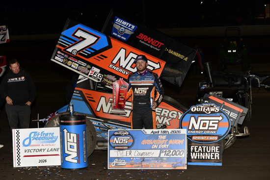 Tyler Courtney wins the 40 lap WOO NOS Energy Drink Sprint Car Series feature at Tri-State Speedway, Haubstadt, Indiana, Sunday night. Mark Funderburk photos