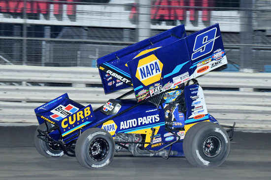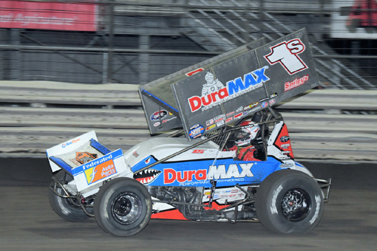 Buddy Kofoid makes 3 in a row taking the 40 lap World of Outlaws NOS Energy Drink Sprint Car Series main event Saturday at Federated Auto Parts Raceway at I-55, Pevely, Missouri. Mark Funderburk photos